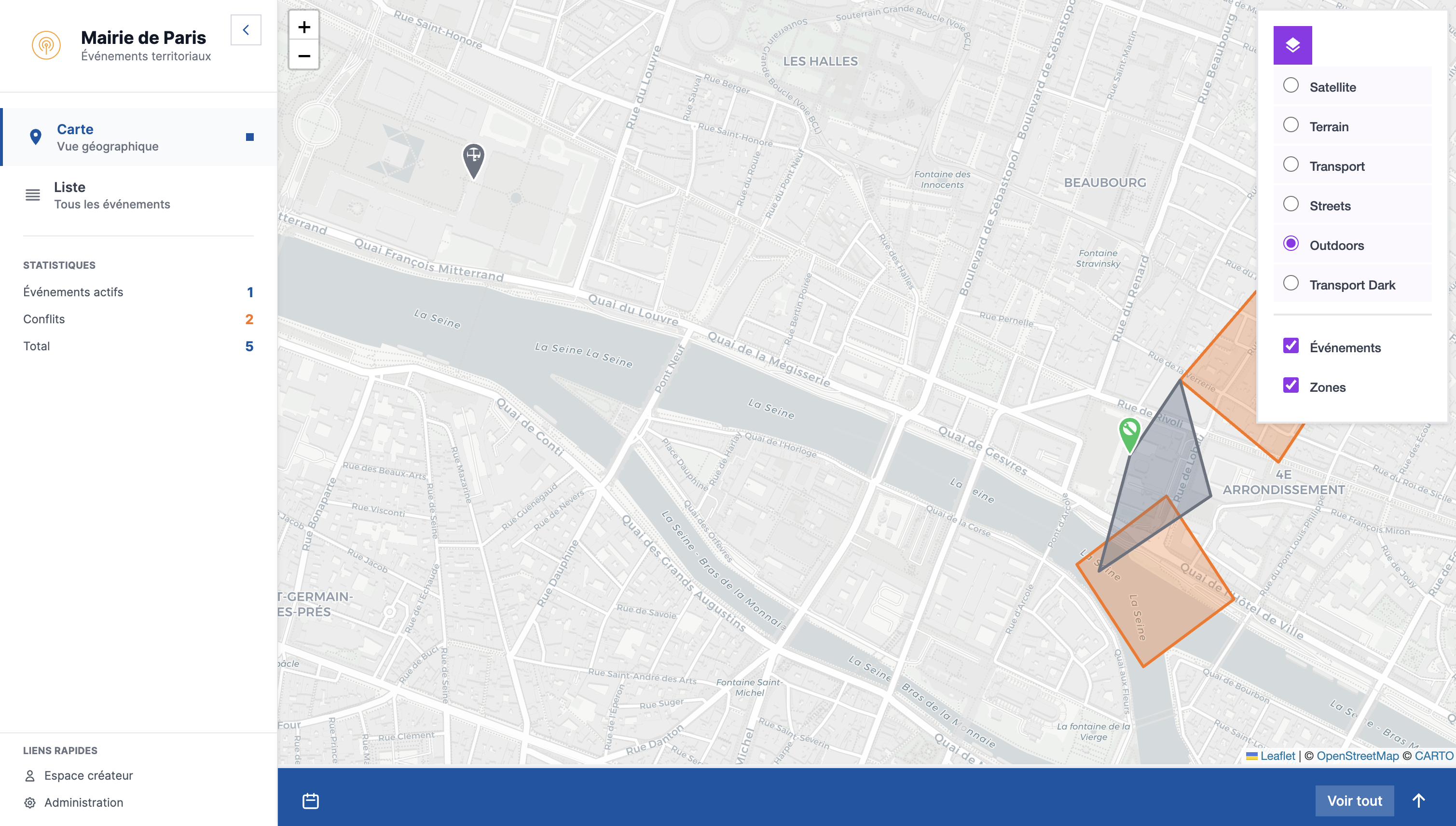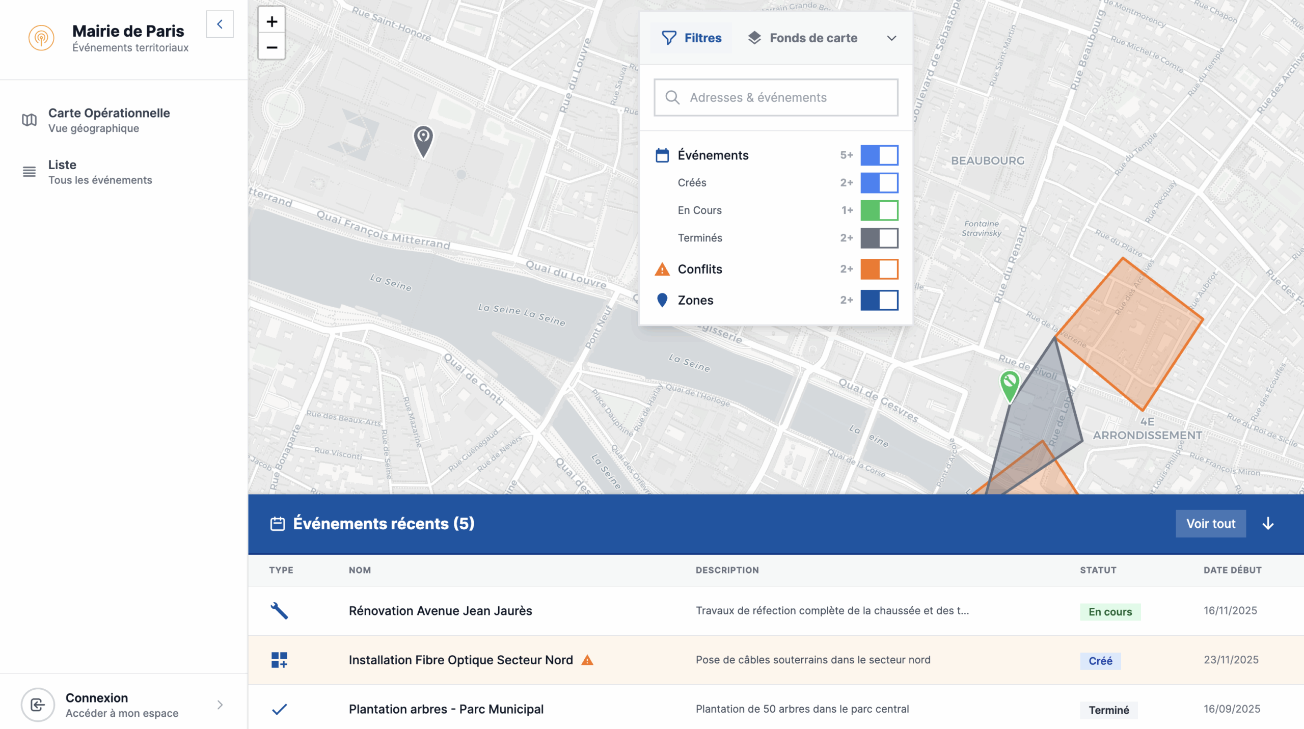 Outil central pour la gestion des événements en temps réel. Il offre une surveillance continue, une contextualisation géographique des événements (localisation, gravité), et permet des actions rapides localisées